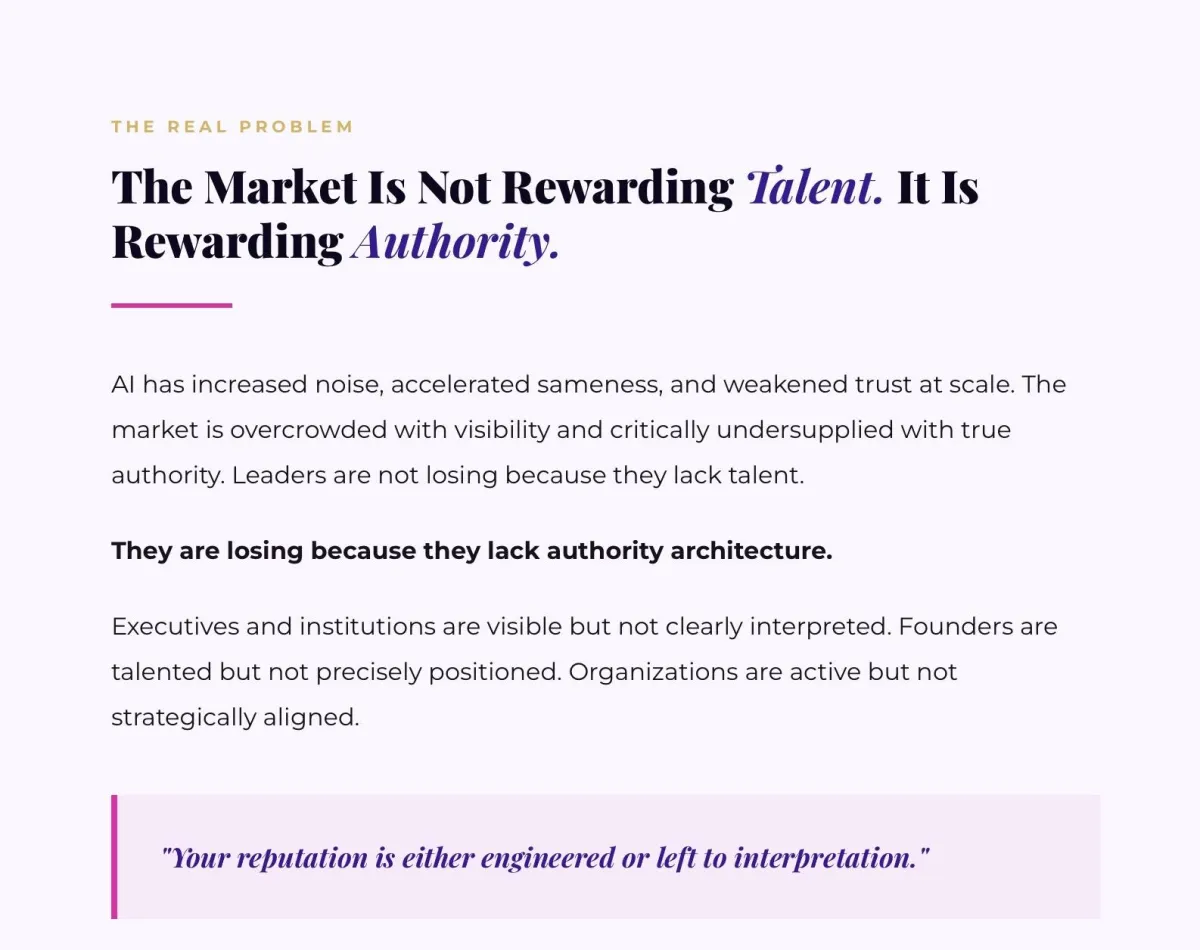 The scalable flagship pillar. This is the global front door for your intellectual property. It moves leaders from confusion and inconsistent self-expression into clarity, confidence, strategic voice, and authority.